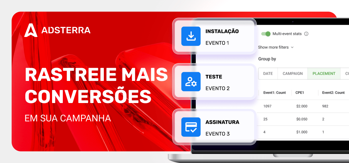 O rastreamento multi‑evento de conversões registra todas as ações significativas dos usuários em uma campanha. Ele oferece insights mais profundos sobre o funil, atribuição mais limpa e mais dados para tomadas de decisão de orçamento mais inteligentes. E tudo isso já está preparado para você na Adsterra. Habilite os postbacks S2S, defina seus eventos e saia além da simples aquisição de tráfego com campanhas de performance cheias de eventos.