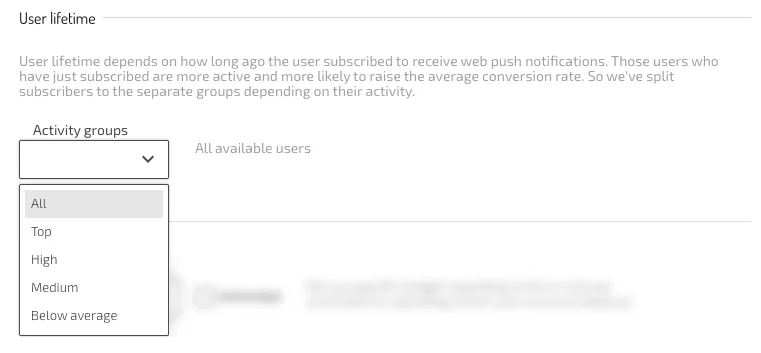 ✅ To improve traffic quality, set a blacklist by IP range and targeting by the users’ subscription lifetime. IP range targeting is available in Advanced settings, and User lifetime settings, where you need to choose proper activity group, are only shown after the AdUnit category is set to “Webpush”. Scroll through each Activity group to review all descriptions and pick the best for you: